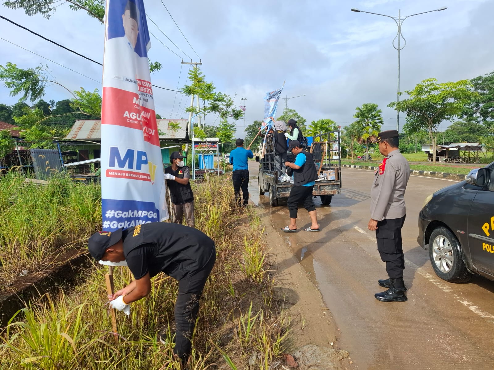 Polres Berau – Dalam rangka memasuki masa tenang Pemilihan Umum (Pemilu) 2024, Polsek Teluk Bayur bersama tim gabungan melaksanakan penertiban baliho, spanduk, dan stiker alat kampanye di Kecamatan Teluk Bayur, Kabupaten Berau, pada Minggu 24 November 2024.