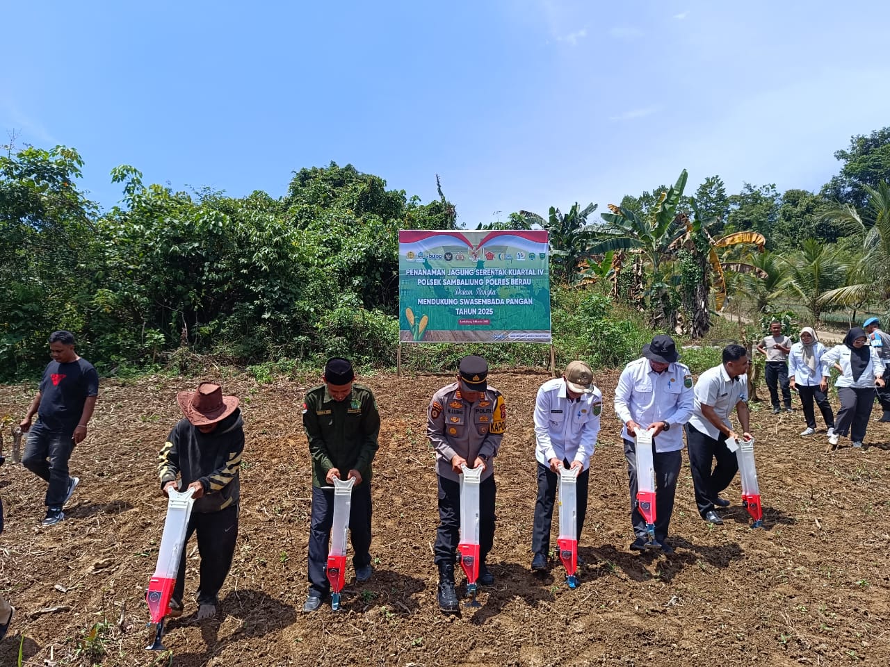 Polres Berau – Dalam rangka mendukung program swasembada pangan tahun 2025, Polsek Sambaliung bersama pemerintah kecamatan dan masyarakat melaksanakan kegiatan Penanaman Jagung Serentak Kuartal IV di wilayah Kecamatan Sambaliung, Kabupaten Berau, Rabu (8/10/2025).