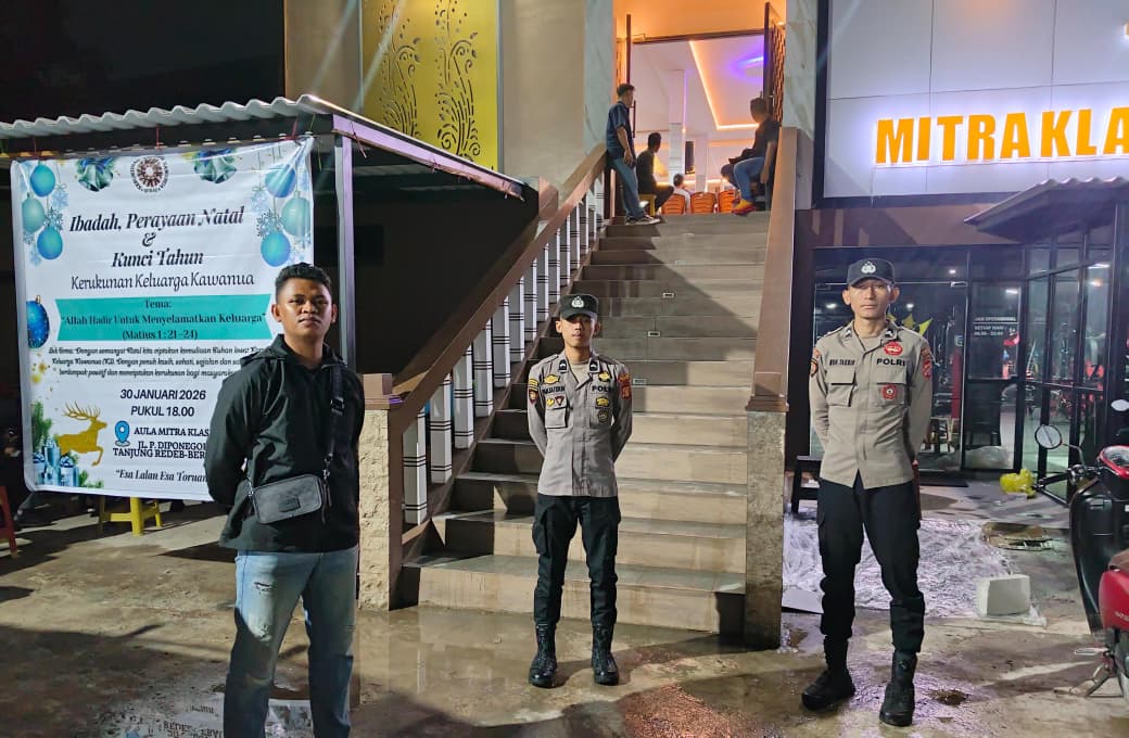 Tanjung Redeb – Guna menjamin keamanan dan kelancaran kegiatan keagamaan, Polsek Tanjung Redeb melaksanakan pengamanan dan patroli dalam rangka perayaan Ibadah Natal dan Kunci Tahun yang diselenggarakan oleh Kerukunan Keluarga Kawanua (KKK) Kabupaten Berau. Kegiatan tersebut berlangsung di Hallroom Mitra Klasik, Jalan P. Diponegoro, Kelurahan Karang Ambun, Kecamatan Tanjung Redeb, Kabupaten Berau.