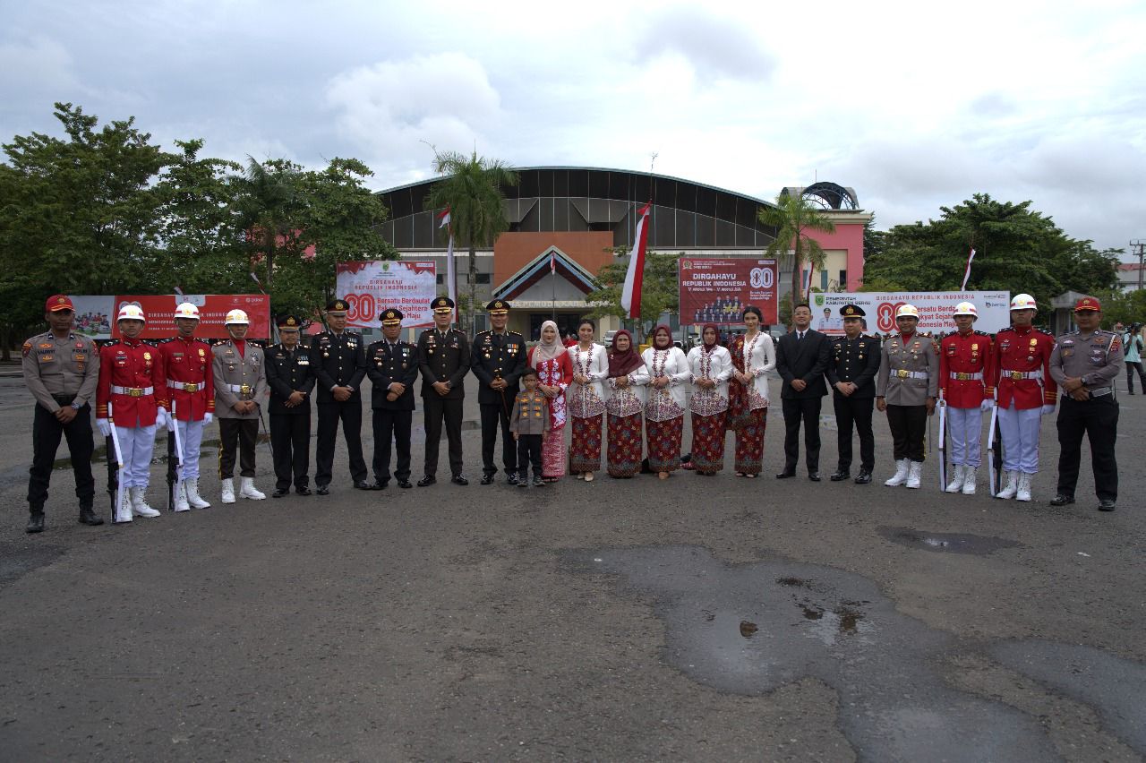 Polres Berau – Kapolres Berau AKBP Khairul Basyar bersama jajaran Pejabat Utama (PJU) Polres Berau menghadiri upacara peringatan Hari Ulang Tahun (HUT) ke-80 Republik Indonesia yang berlangsung di Gelanggang Olahraga (GOR) Pemuda, Minggu (17/8/2025). Upacara tersebut dipimpin langsung Bupati Berau Hj. Sri Juniarsih Mas, dengan diikuti oleh seluruh unsur Forkopimda, TNI-Polri, pelajar, organisasi, serta masyarakat umum.