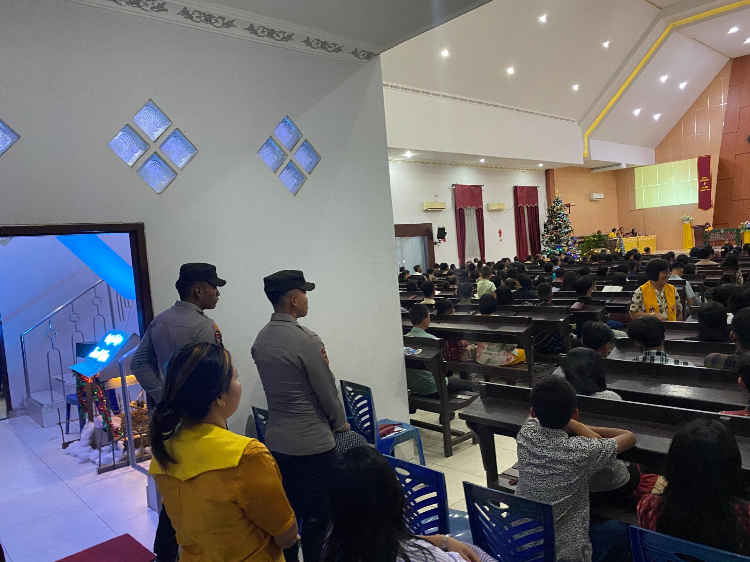TANJUNG REDEB – Polres Berau melalui personel Polsek Tanjung Redeb melaksanakan pengamanan terhadap kegiatan Ibadah Umat Nasrani dalam rangka Perayaan Natal 2024 dan Tahun Baru 2025 di Gereja Toraja Gideon, Tanjung Redeb, pada Selasa, 24 Desember 2024. Kegiatan berlangsung dari pukul 18.00 hingga 18.45 WITA, dihadiri oleh sekitar 400 jemaah.