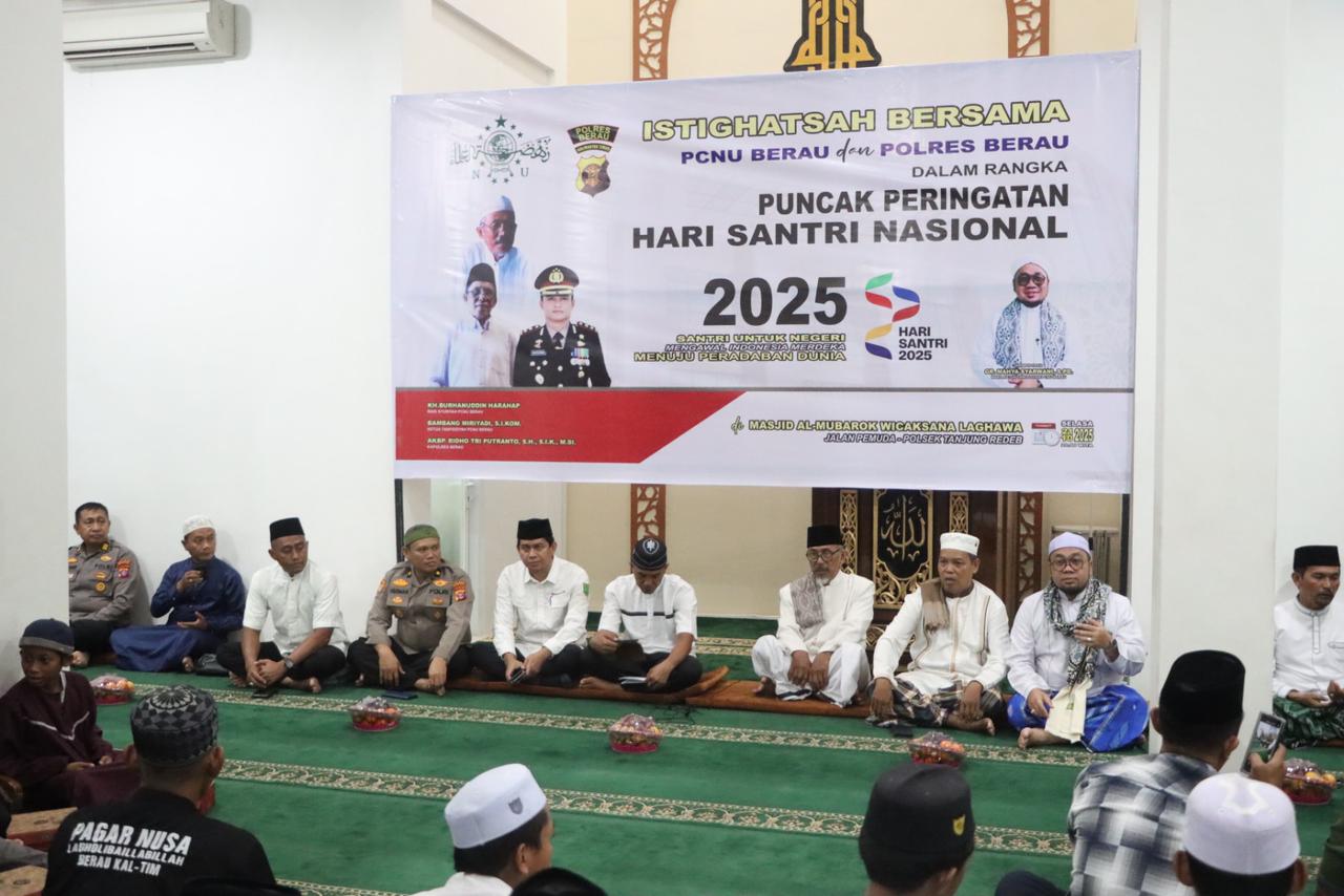 Polres Berau – Dalam rangka puncak peringatan Hari Santri Nasional tahun 2025, Polres Berau bersama Pengurus Cabang Nahdlatul Ulama (PCNU) Berau menggelar kegiatan Istighatsah Bersama di Masjid Al Mubarok Wicaksana Laghawa, Jalan Pemuda, Kecamatan Tanjung Redeb, pada Selasa (21/10/2025) malam. Kegiatan berlangsung khidmat dan penuh makna dengan dihadiri para tokoh agama, santri, serta jajaran Forkopimda Kabupaten Berau.