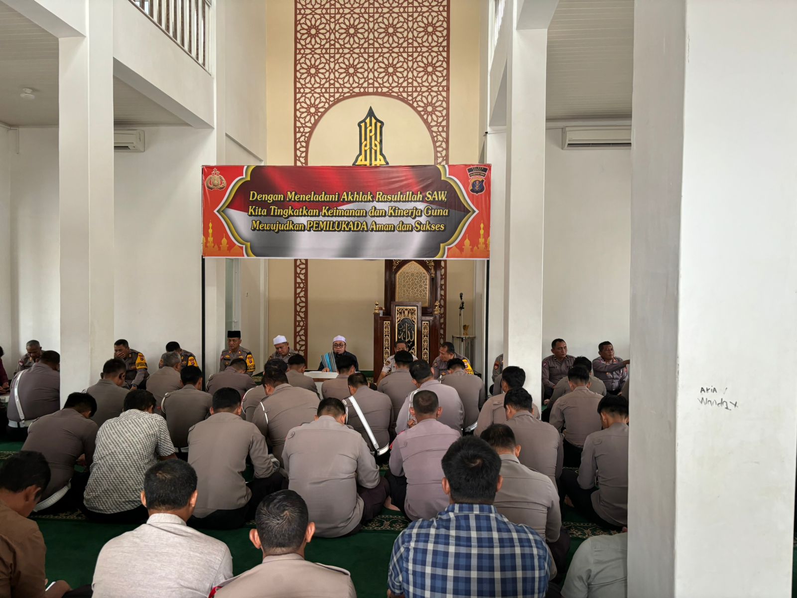 Kegiatan dimulai dengan pembacaan sholawat yang diikuti dengan ceramah agama oleh Ustadz Mahya Syarwani. Dalam ceramahnya, Ustadz Mahya menekankan pentingnya meneladani akhlak Rasulullah SAW dalam menjalankan tugas sehari-hari, terutama bagi anggota Kepolisian. Ia menyampaikan bahwa sifat jujur, amanah, dan sabar yang dimiliki Rasulullah SAW merupakan contoh nyata yang dapat diaplikasikan dalam melayani masyarakat dan menjaga keamanan.