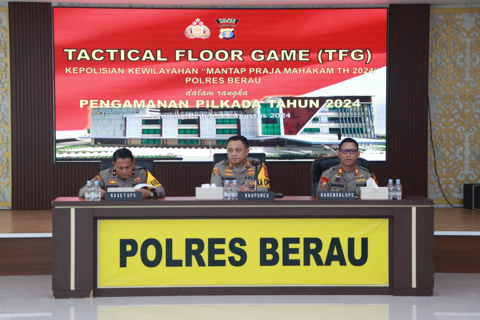 Polres Berau – Dalam rangka mempersiapkan pengamanan Pemilihan Kepala Daerah (Pilkada) Kabupaten Berau Tahun 2024, Polres Berau melaksanakan kegiatan Tactical Floor Game (TFG) sebagai bagian dari rangkaian Operasi Mantap Praja 2024. Kegiatan ini digelar pada Sabtu, 31 Agustus 2024, di Aula Rupatama Polres Berau dan dipimpin oleh Kapolres Berau, AKBP Steyven Jonly Manopo.