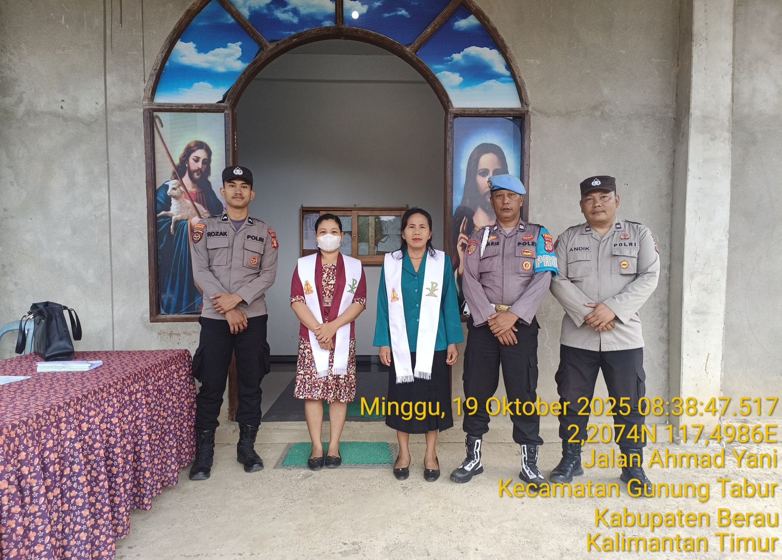 Gunung Tabur – Polsek Gunung Tabur melaksanakan kegiatan pengamanan ibadah Minggu di Gereja Toraja Jemaat Hermon Parma yang berlokasi di Jalan Poros Bulungan RT 012, Kelurahan Gunung Tabur, Kabupaten Berau. Kegiatan ini bertujuan untuk memastikan pelaksanaan ibadah berjalan dengan aman, tertib, dan penuh kekhidmatan.
