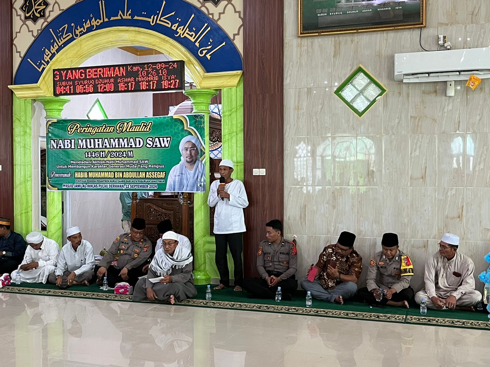 Polres Berau – Pada hari Kamis, 12 September 2024, pukul 09.00 Wita hingga 12.00 Wita, bertempat di Masjid Jami Al-Ikhlas Kampung Pulau Derawan, Kecamatan Pulau Derawan, Kabupaten Berau, berlangsung peringatan Maulid Nabi Muhammad SAW 1446 H / 2024 M dengan menghadirkan penceramah Habib Muhammad Bin Abdullah Assegaf, pimpinan Pondok Pesantren Nurul Zahro dari Kota Pasuruan, Jawa Timur.