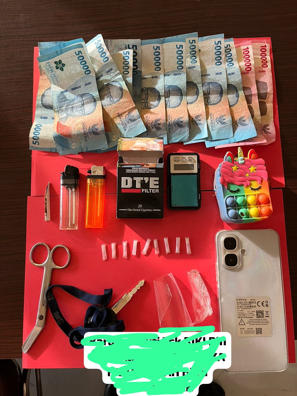 Barang bukti yang berhasil diamankan antara lain sembilan poket kecil sabu dengan berat bruto 0,35 gram, satu timbangan digital, satu gunting, dua korek api, dua unit handphone warna silver, satu kotak rokok, satu kertas sendok, satu unit sepeda motor warna hitam, satu dompet bermotif warna-warni, dua plastik bening, satu sweater warna putih, serta uang tunai sebesar Rp800.000.