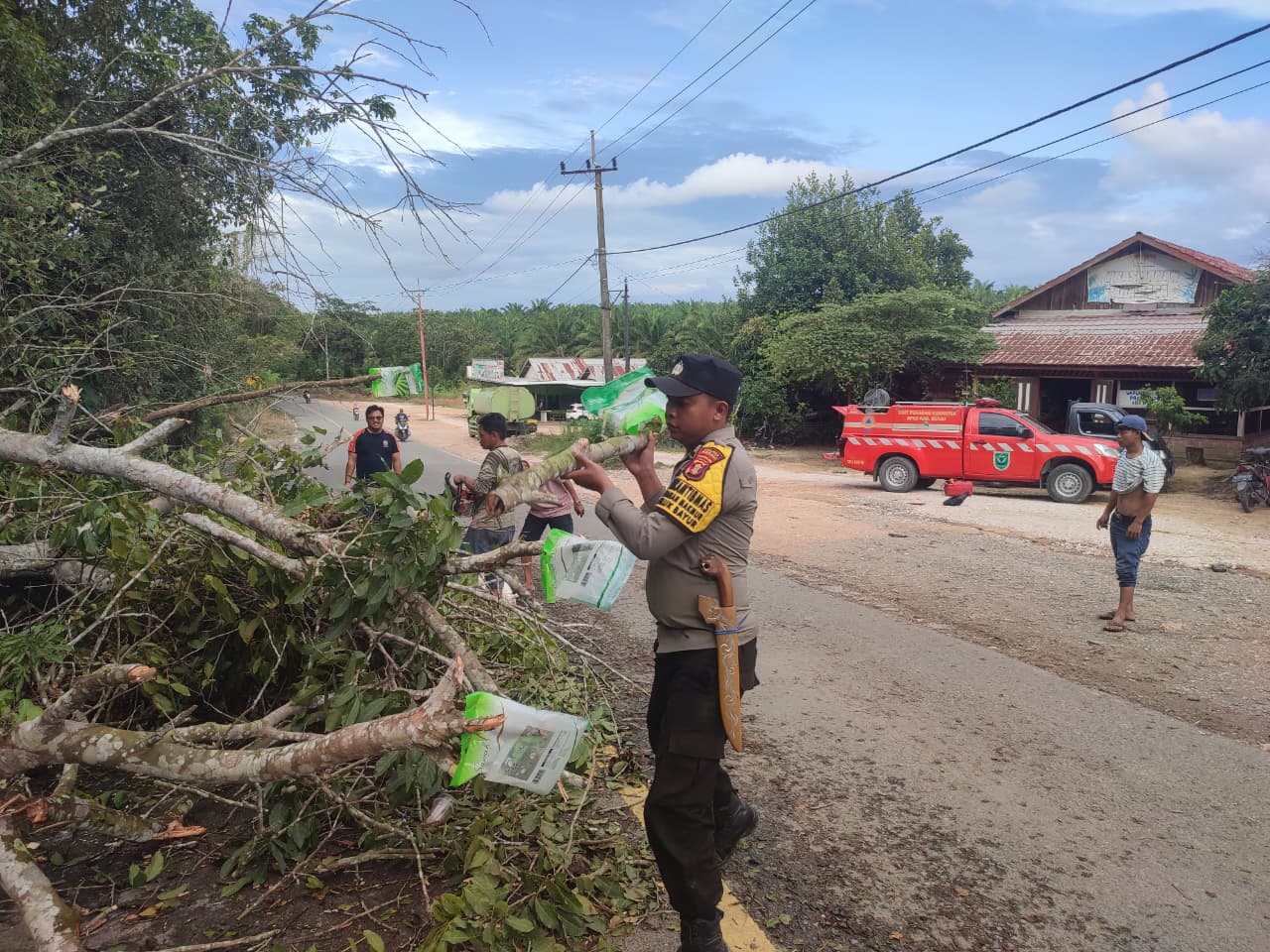 Evakuasi dilakukan oleh personel Bhabinkamtibmas Kampung Labanan Makmur Brigpol Sanusi bersama anggota BPBD Labanan dan masyarakat setempat. Petugas melakukan pemotongan batang dan ranting pohon yang menutup badan jalan, kemudian membersihkan sisa-sisa material agar jalur dapat kembali dilalui kendaraan. “Sinergi antara petugas dan masyarakat sangat membantu percepatan proses evakuasi,” jelas Kapolsek.