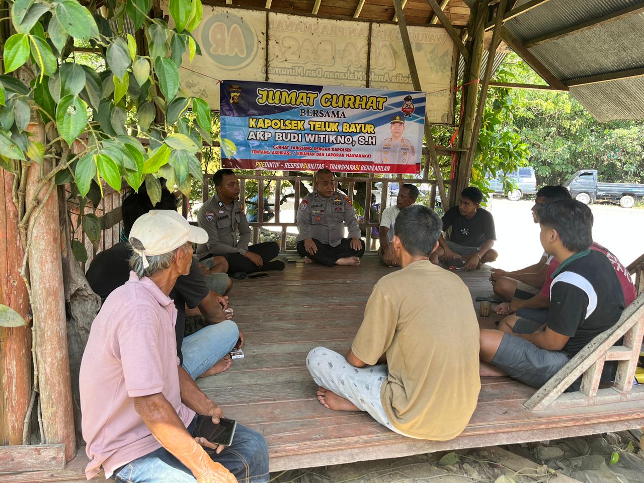 Polres Berau – Dalam rangka menjalin silaturahmi dan mempererat komunikasi antara polisi dan masyarakat, Pospol Labanan Polsek Teluk Bayur melaksanakan kegiatan Jumat Curhat di Jl. Poros Samarinda RT 009 Kampung Labanan Makmur, Kecamatan Teluk Bayur, pada Jumat (17/10/2025) pukul 09.00 Wita hingga selesai. Kegiatan ini dihadiri oleh Kapospol Labanan Aipda Agus Juprianto, Bhabinkamtibmas Kampung Labanan Makmur Brigpol Sanusi, Anggota Pospol Labanan Bripda Nurfani P, serta beberapa warga yang antusias mengikuti kegiatan tersebut.