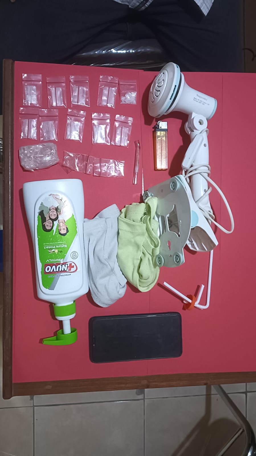 Dalam pemeriksaan, petugas menemukan sembilan poket kecil dan satu poket sedang yang diduga sabu dengan total berat bruto 7,20 gram. Barang bukti tersebut disembunyikan di dalam botol sabun cair yang dibungkus pakaian anak-anak, serta sebagian lainnya disimpan di dalam kipas angin jepit. Selain itu, turut diamankan satu unit handphone, plastik klip, pipet kaca, sedotan alat hisap, korek api, serta tas warna hitam. “Modus penyembunyian dilakukan di beberapa benda agar tidak mudah terdeteksi, namun berhasil kami ungkap,” jelas AKP Agus Priyanto.