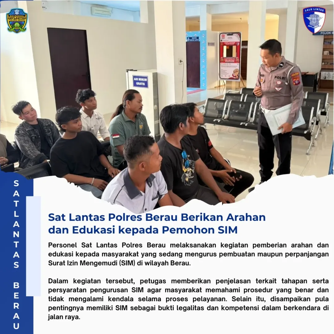 Personel Sat Lantas Polres Berau melaksanakan kegiatan pemberian arahan dan edukasi kepada masyarakat yang sedang mengurus pembuatan maupun perpanjangan Surat Izin Mengemudi (SIM) di wilayah Berau.
