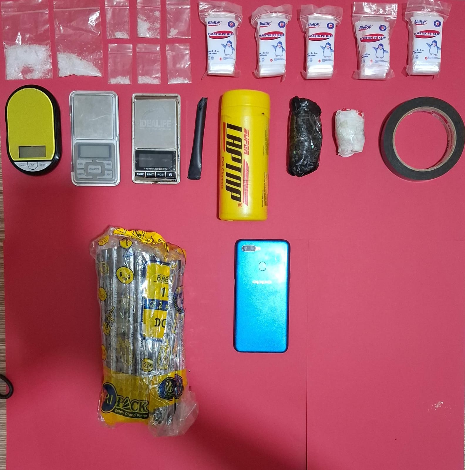Saat dilakukan penangkapan, petugas kemudian melakukan interogasi serta penggeledahan badan yang disaksikan oleh warga setempat. Dari hasil penggeledahan tersebut, ditemukan sejumlah barang bukti narkotika dan peralatan yang diduga digunakan untuk aktivitas peredaran sabu. “Kami menemukan dua bungkus sedang dan enam bungkus kecil sabu dengan total berat bruto 11,56 gram, serta berbagai barang bukti pendukung lainnya,” jelasnya.
