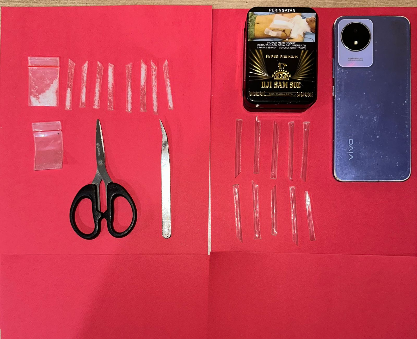 Adapun barang bukti yang diamankan antara lain 1 bungkus kecil sabu, 8 poket kecil sabu, gunting kecil, pinset, plastik klip bekas sabu, kotak rokok warna hitam, 10 plastik pembungkus bekas sabu, serta satu unit telepon genggam warna ungu.