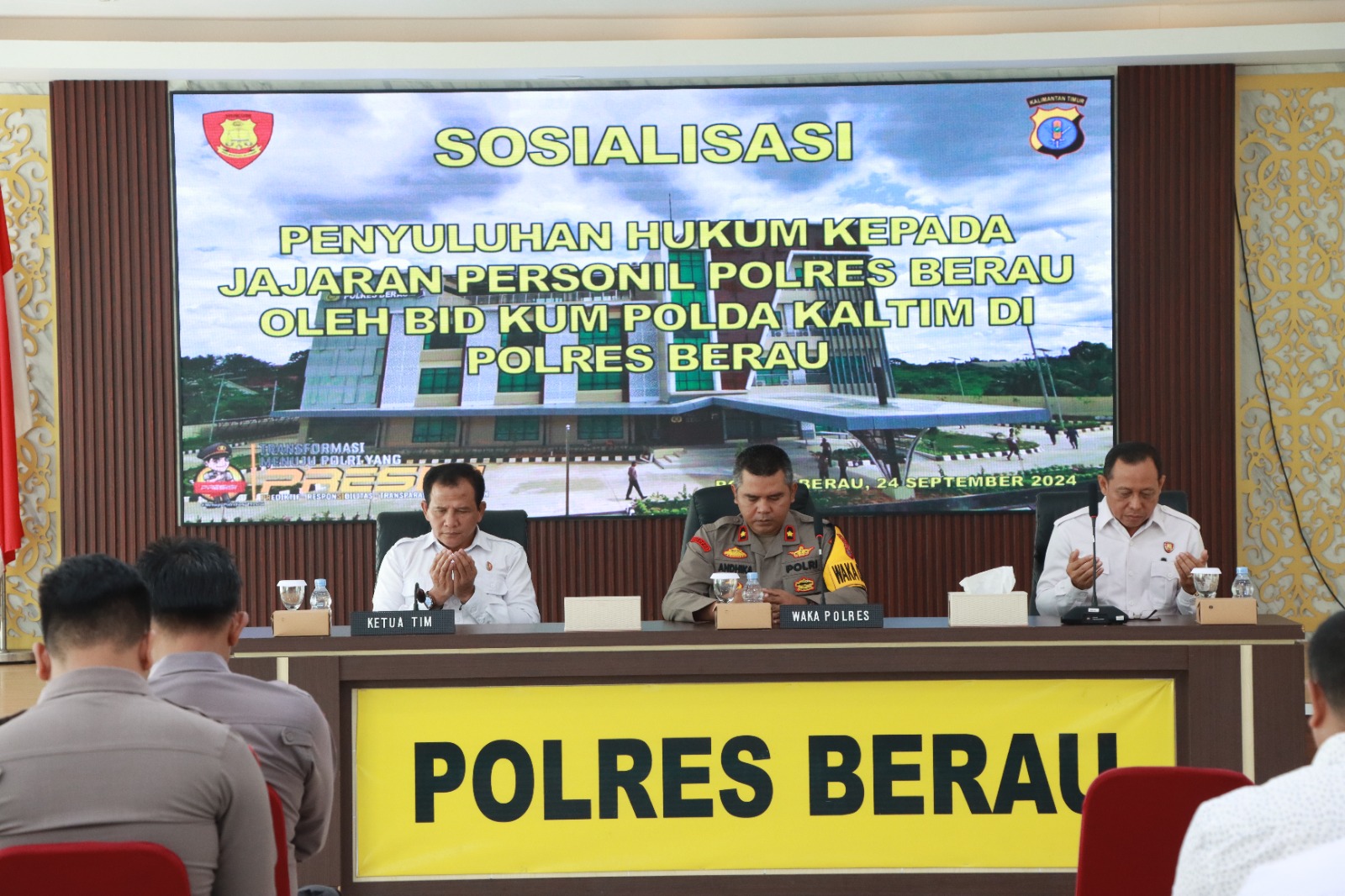 Polres Berau – Kegiatan Sosialisasi dan Penyuluhan Hukum Semester II Tahun 2024 di lingkungan Polres Berau dilaksanakan pada Selasa, 24 September 2024, di Ruang Rupatama Polres Berau, Jl. Gatot Subroto, Tanjung Redeb. Acara ini berlangsung dari pukul 09.00 hingga 12.00 WITA dengan dihadiri oleh Waka Polres Berau, para pejabat utama, Kapolsek jajaran Polres Berau, serta 70 personel dari jajaran Polres Berau.