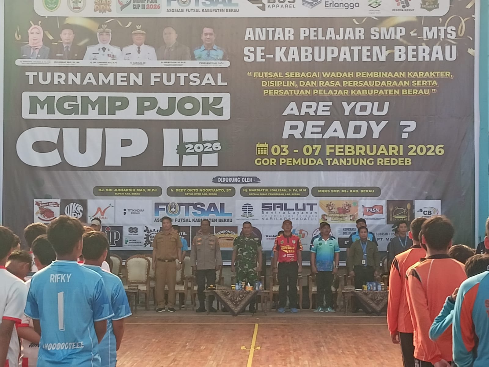 Kegiatan yang dimulai sekitar pukul 09.00 WITA tersebut dihadiri oleh sejumlah unsur Forkopimda dan stakeholder terkait, di antaranya Pasi Pers Kodim 0902/Berau Kapten Arm Hermanto, Sekretaris Dispora Kabupaten Berau Drs. Kesuma Sirajuddin, M.Si, para ketua MGMP lintas jenjang pendidikan, perwakilan organisasi olahraga, pihak sponsor, serta para peserta turnamen futsal MGMP PJOK CUP III Tahun 2026.