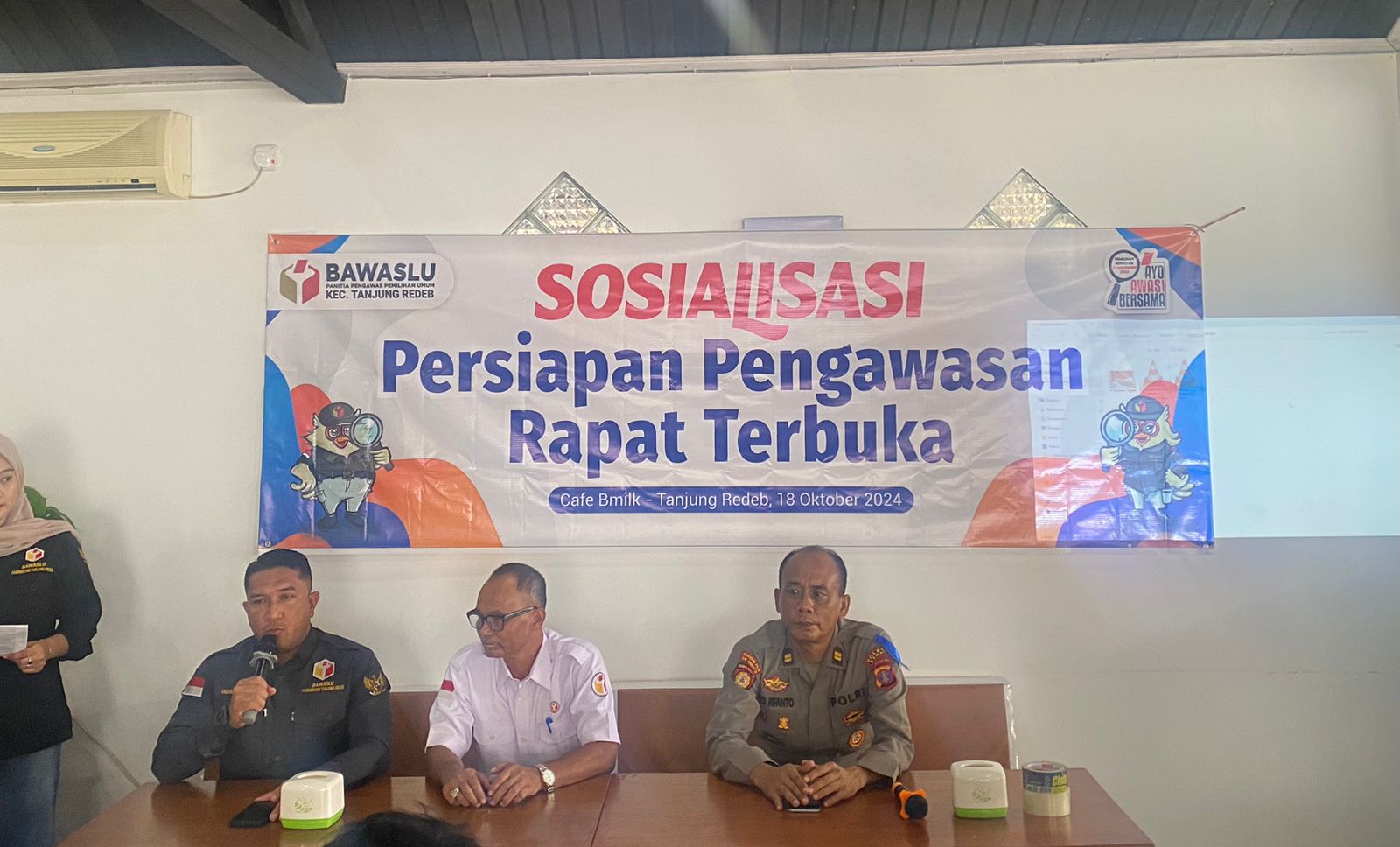 Polres Berau – Pada hari Jumat, 18 Oktober 2024, pukul 15.00 WITA, bertempat di Cafe Bmilk, Jalan Andika, Kelurahan Gayam, Kecamatan Tanjung Redeb, Kabupaten Berau, dilaksanakan kegiatan sosialisasi persiapan pengawasan rapat terbuka yang difasilitasi oleh Panwascam Tanjung Redeb. Kegiatan ini dihadiri oleh berbagai elemen, termasuk jajaran keamanan dari TNI dan Polri serta tim sukses dari berbagai pasangan calon (paslon) dalam Pilkada 2024.